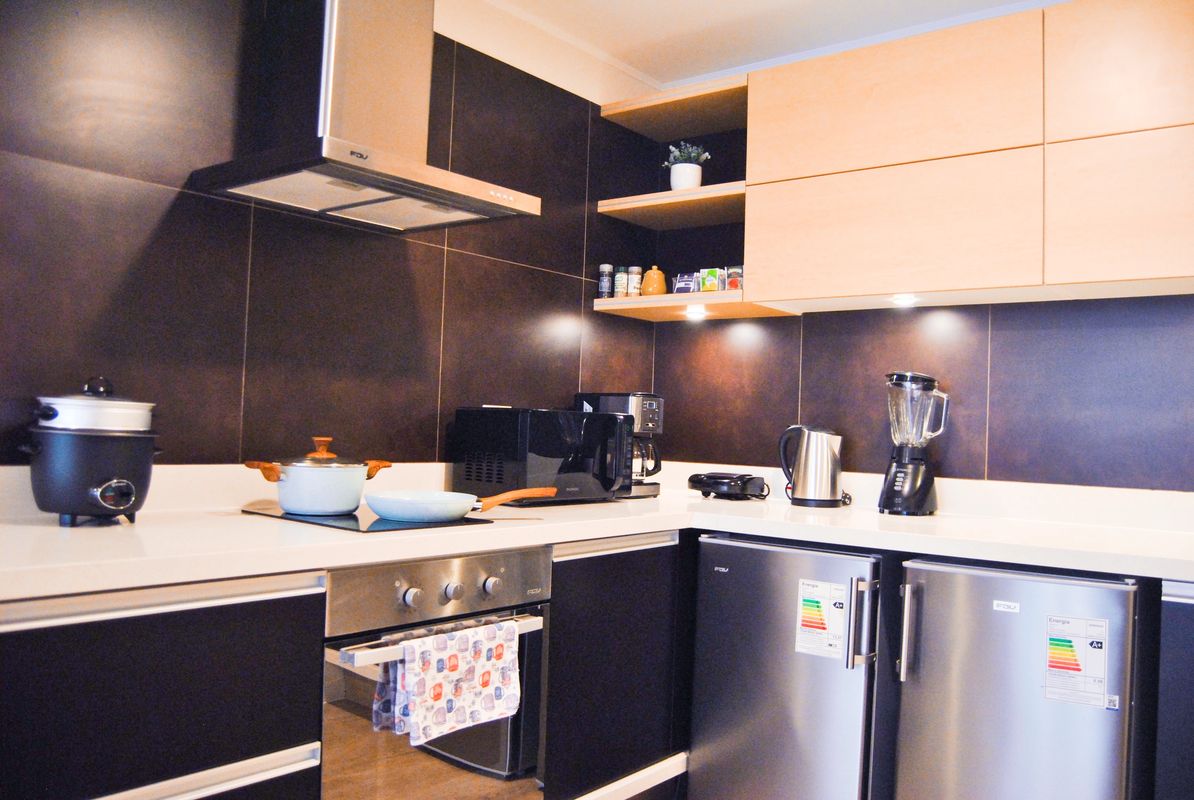 La cocina es minimalista con campana extractora y horno eléctrico acompañada de minibar y nevera, y se encuentra equipada olla arrocera, cafetera, licuadora, waflera, ollas y sartenes, cubiertos, platos, vasos y tazas.
